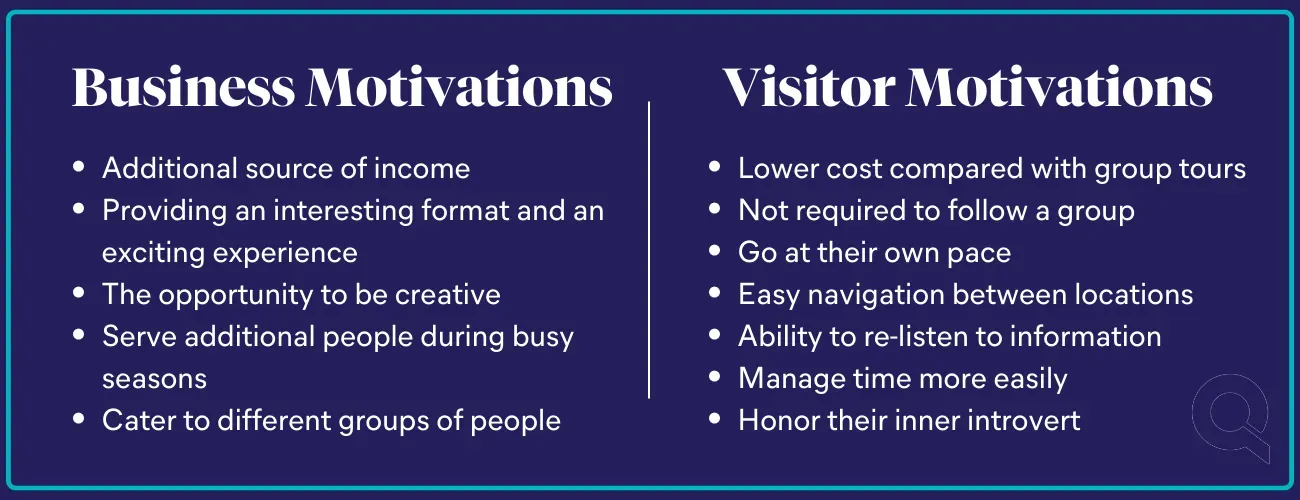 In their paper, A critical evaluation of mobile guided tour apps: Motivators and inhibitors for tour guides and customers, Podsukhina et al found that the main motivators for operators creating digital tours are:
